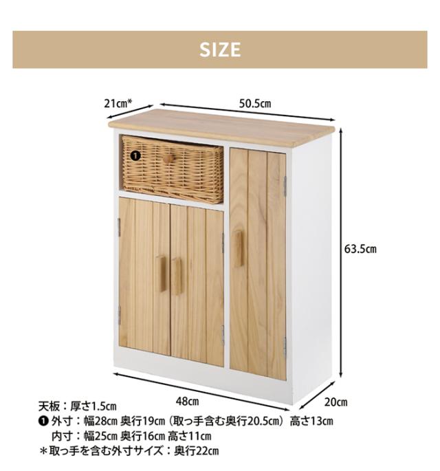 | [全体]幅50.5×奥行21×高さ62.5cm [天板]幅50.5×奥行21cm [インナーバスケット]幅28×奥行19(取っ手含む:20.5)×高さ13cm [天板厚]1.5cm |