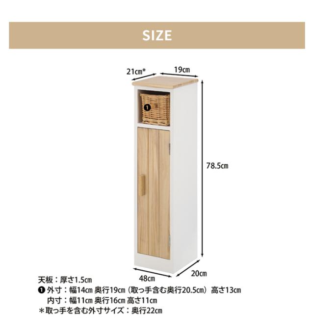 | [全体]幅19×奥行21(取っ手含む:22)×高さ78.5cm [天板]幅19×奥行21cm [インナーバスケット]幅14×奥行19(取っ手含む:20.5)×高さ13cm [天板厚]1.5cm |