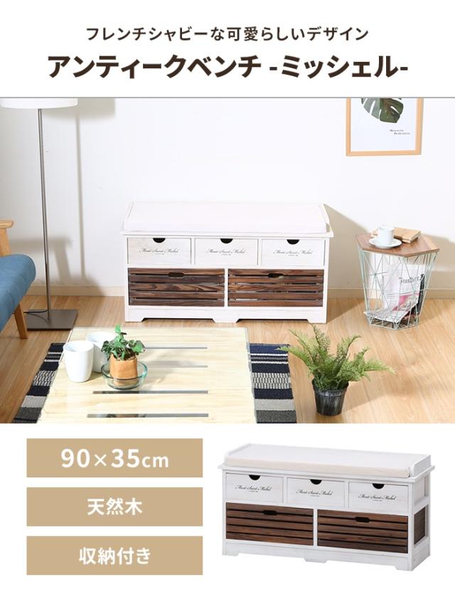【値下げ】アンティークベンチ 収納ベンチ 幅90 北欧風 ベンチチェア 椅子 座れる 収納できる ホワイトウォッシュ加工 フレンチカントリー