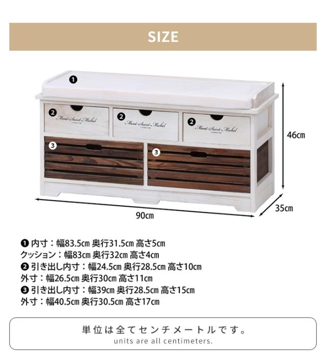 | [全体]幅90×奥行35×高さ46cm [クッション]幅83×奥行32×高さ4cm [引出(小)外寸]幅26.5×奥行30×高さ11cm [引出(大)外寸]幅40.5×奥行30.5×高さ17cm |