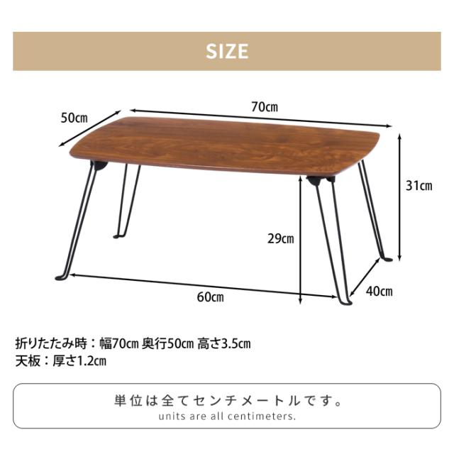 | [全体]幅70×奥行50×高さ31cm [天板厚]1.2cm [折畳時]70×50×3.5cm |