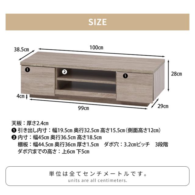 | [全体]幅100×奥行38.5×高さ28cm [天板・地板厚]2.4cm [棚板厚]1.5cm |