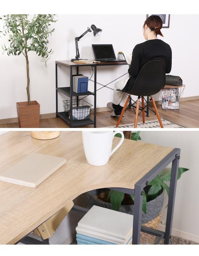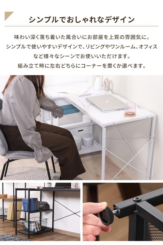 キーワード: パソコンデスク L字 デスク ラック付き 幅110 奥行58 木目調 PCデスク ワークデスク 左右組み換え可能 学習机 勉強机 L字デスク オフィスデスク 書斎デスク 作業デスク シンプルデスク 事務机 つくえ テーブル 収納棚付き 木目天板 異素材 シンプル モダン おしゃれ 書斎 リビング 在宅 テレワーク