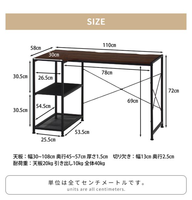| [全体]幅110×奥行58×高さ72cm [天板]幅30・108×奥行57・45×厚さ1.5cm [切り欠き]幅10×奥行2.5cm |