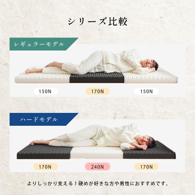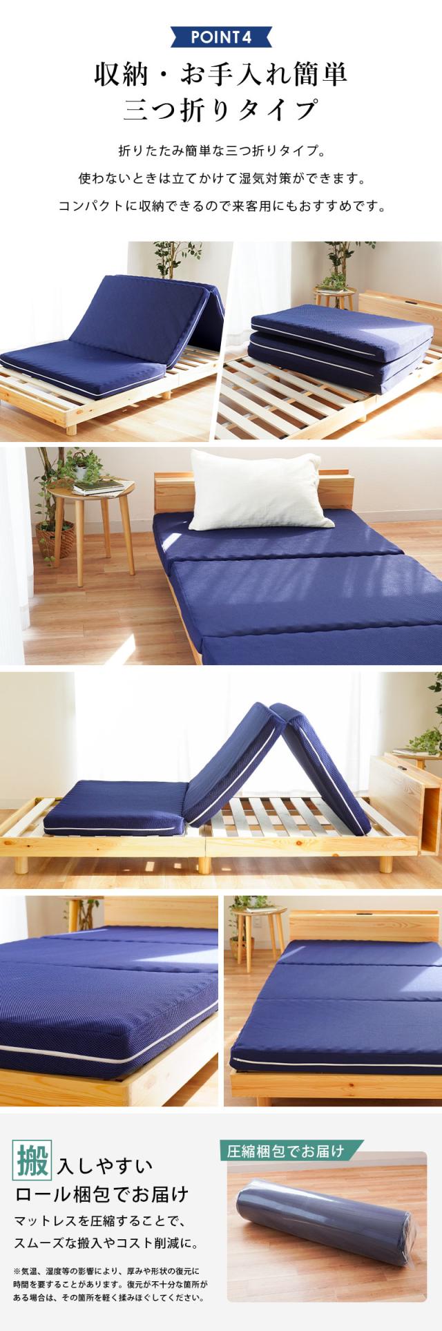 | ・自慢の国内自社工場製 【日本国産ウレタン使用】品質に定評のある、高品質なウレタンフォームを使用しています。 特に体重のかかる中央部分(腰部)を硬めにしたバランス構造。背中、腰部分の沈み込みが少なく、腰への負担を軽減します。腰痛でお悩みの方にもおすすめです。 ・硬めの高反発ウレタンが寝返りをサポート高い反発力・程よいクッション性で寝返りをサポート。寝返りをすることで血行を促し、身体の負担を軽減するとともに、身体と敷き布団の間にある湿気を発散してくれます。 ・理想的な寝姿勢をキープする形状一つ一つの「点」が優しく全身を支えてくれます。この形状で身体に合わせて体圧分散し、立ち姿に近い理想の寝姿勢をキープします。 ・底付き感のないしっかりとした寝心地床に直接敷いても底付き感がなく、しっかりとしたクッション性のある寝心地です。 側生地はサラッとした肌触りで通気性が抜群のメッシュ素材を使用しています。側面にはファスナーが付いているため、外して丸洗いが可能です。 折りたたみ簡単な三つ折りタイプ。使わないときは立てかけて湿気対策ができます。コンパクトに収納できるので来客用にもおすすめです。 ・搬入しやすいロール梱包でお届けマットレスを圧縮することで、スムーズな搬入やコスト削減に。 | |