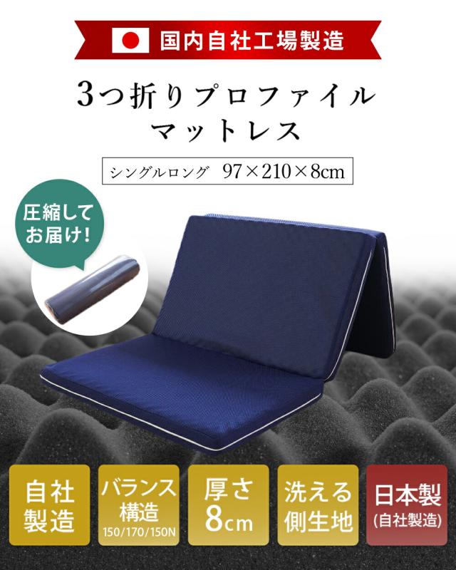 自社製造 マットレス 高反発 三つ折り シングルロング 厚み8cm 日本製ウレタン使用 150N 腰部分が170N バランス 国産 当社限定