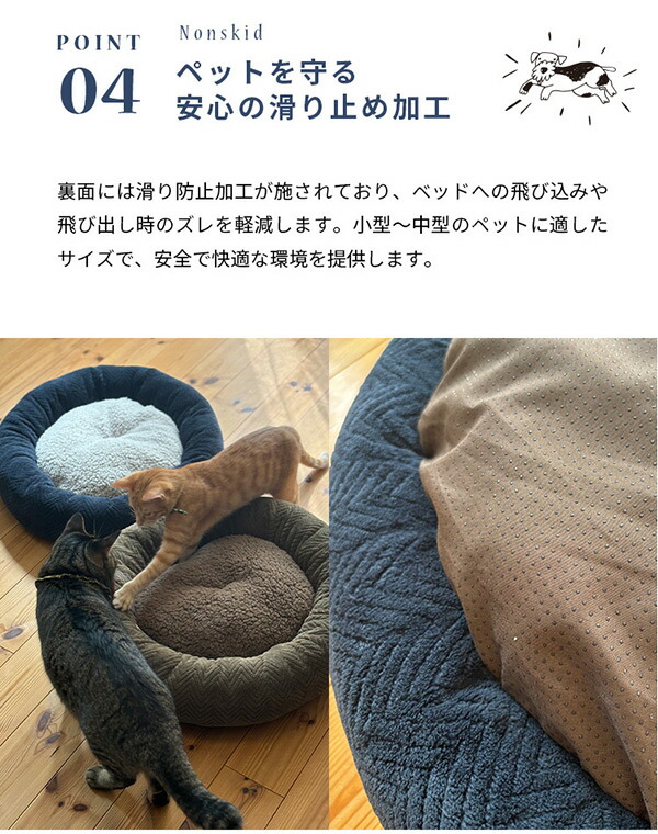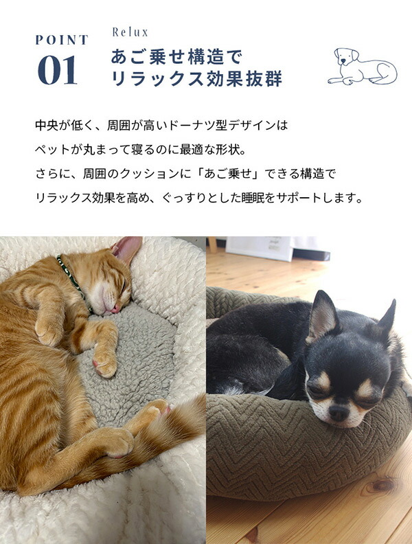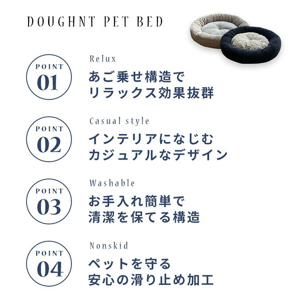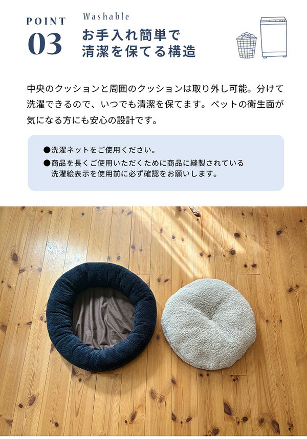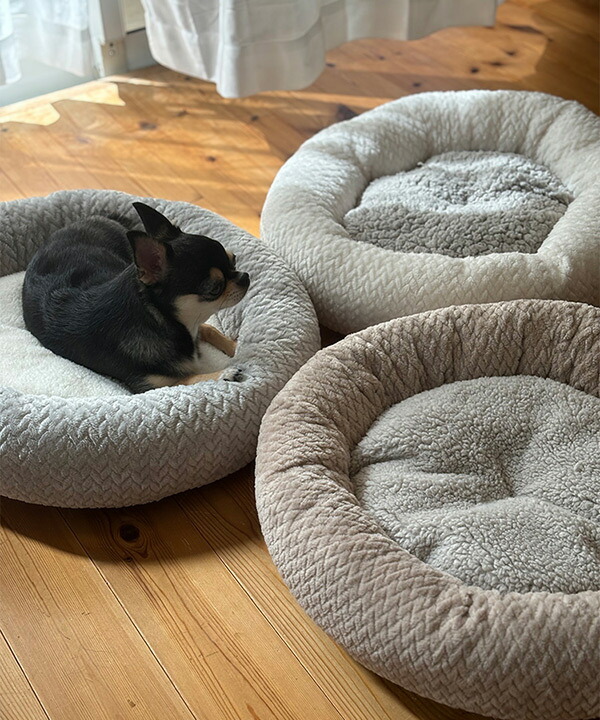 | 商品説明 | ●愛犬や愛猫が思わず飛び込んでしまうドーナツ型ぺットベッド ●あご乗せ構造でリラックス効果抜群 ●インテリアになじむカジュアルなデザイン ●お手入れ簡単で清潔を保てる構造 ※洗濯ネットをご使用ください ●ペットを守る安心の滑り止め加工 ●外寸直径:約50cm ●内寸直径:約40cm ●厚み:約10cm ※ご使用環境やご使用方法により塩化ビニル・フローリング等床材の変色が起こることがあります。特に新築の床材・ワックス掛け直後はご注意ください ※長時間敷いたままにすると裏面の滑り止めが付着する場合があります |