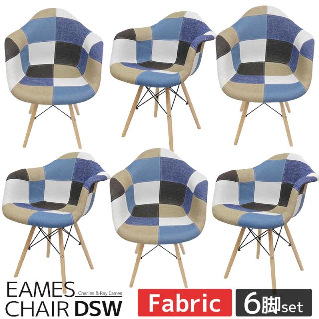 イームズ チェア パッチワーク DAW Eames アームシェルチェア 木脚 デザイナーズ 家具 ダイニングチェア 北欧テイスト ファブリック パッチワーク デニム色 6脚セット【EM-37】