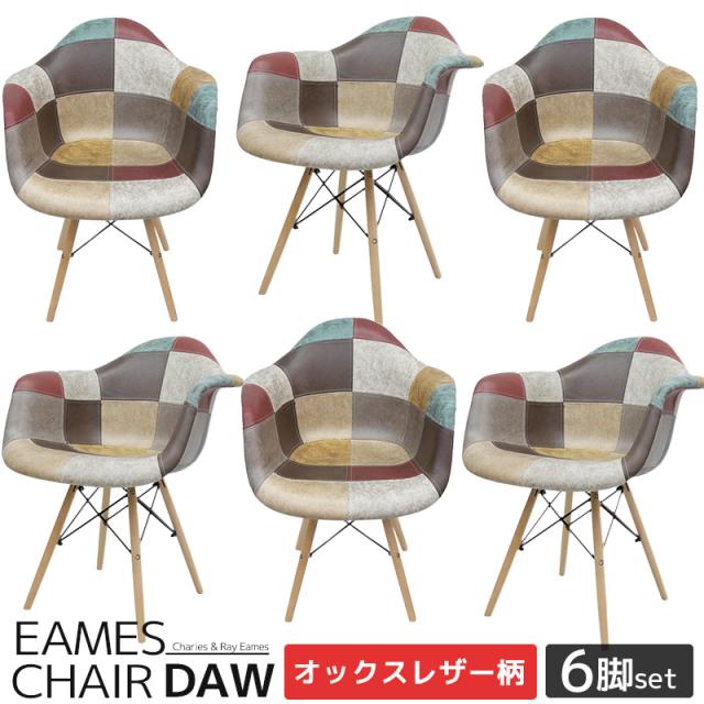 イームズ チェア レザー パッチワーク DAW Eames ヴィンテージ レザー合皮柄 オックス生地 アームシェルチェア 木脚 デザイナーズ 家具 イームズチェア 北欧テイスト レザー 6脚セット【EM-38】