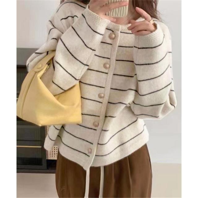 ニット生地に存在感をまろやかにした細ボーダー柄、カジュアルながらも女性らしいきれいめ着こなしに導いてくれるニットカーディガン
