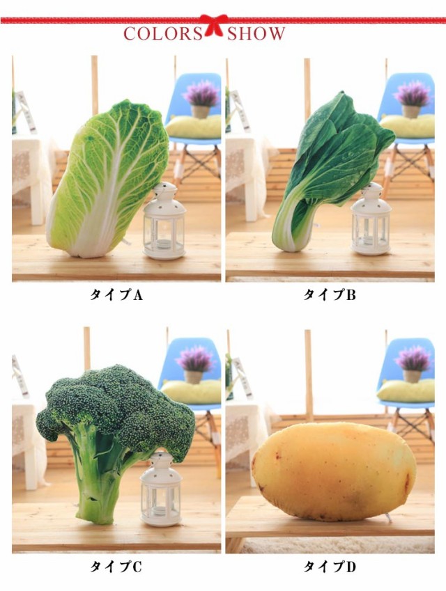 | お部屋にポップな印象を!リアルな野菜のクッションです! 滑らかな手触りで一年中使える心地よい素材です。 厚みがあるのでふかふかの使い心地に!形も崩れにくい。 お部屋、ソファ、車などに置いておくのも可愛い抱き枕です。 | |