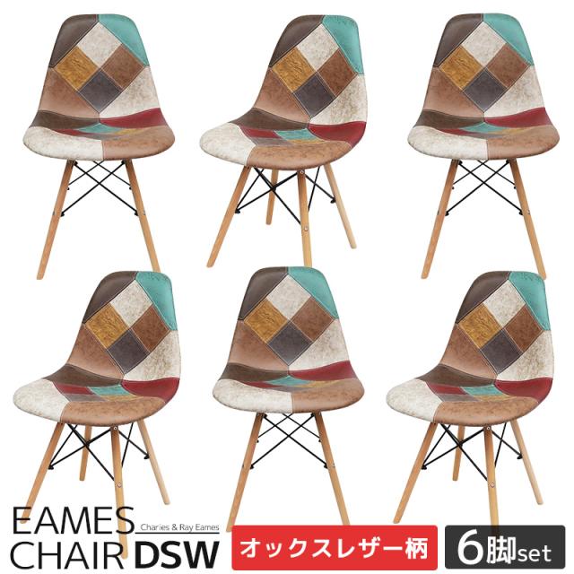 イームズ チェア パッチワーク Eames DSW ヴィンテージ レザー合皮柄 オックス生地 スクープ デザイナーズ家具 イームズチェア ダイニングチェア おしゃれ レザー 6脚セット EM-57