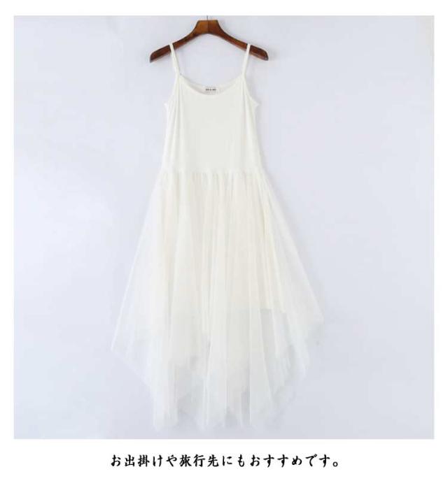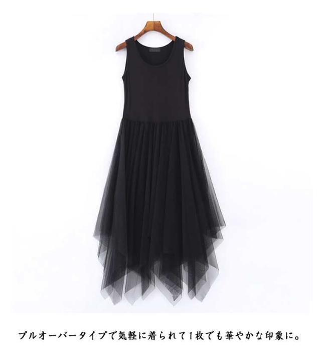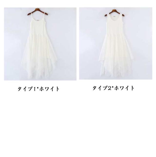 チュールドッキング タンクトップワンピース レディース 夏 レース ノースリーブ インナーワンピース チュールスカート タンクトップ 膝下丈 無地 シンプル カジュアル ロング丈 ロングワンピース チュールドッキングワンピース ヘムライン裾 可愛い