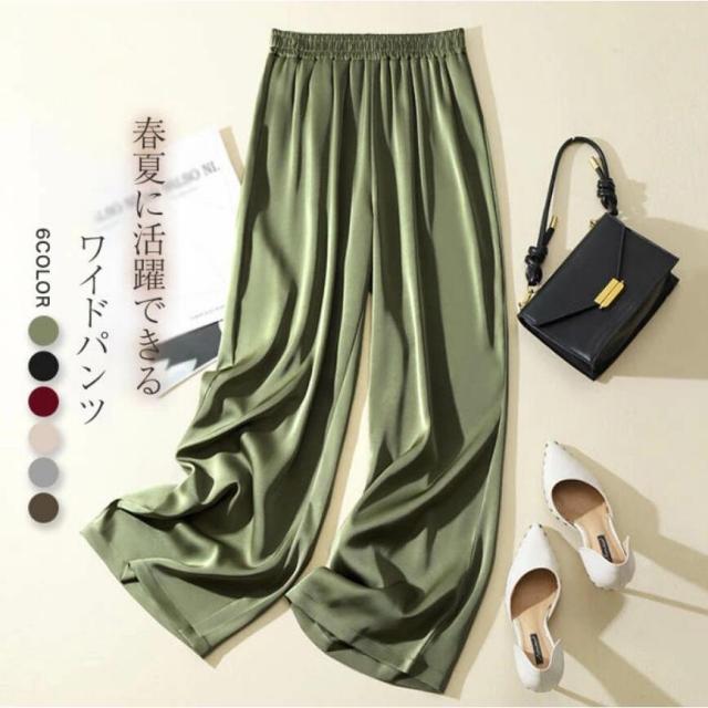 ワイドパンツ レディース 春 夏 ロング丈 ガウチョパンツ 体型カバー ロング パンツ サテン ウエストゴム 大きいサイズ 着痩せ 美脚 通勤 可愛い