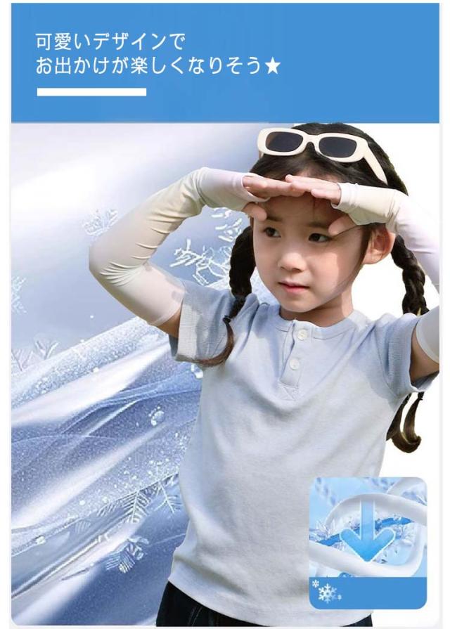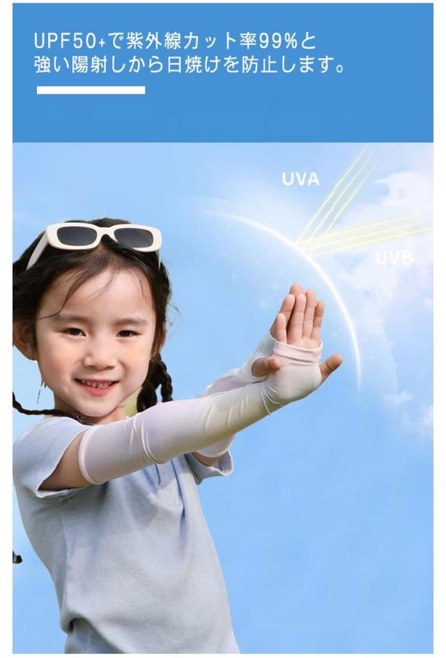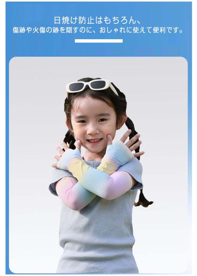 | 冷感素材の日焼け防止ができるキッズ用冷感アームカバーです。 UPF50+で紫外線カット率99%と強い陽射しから日焼けを防止します。 可愛いデザインでお出かけが楽しくなりそう★ 日焼け防止はもちろん、傷跡や火傷の跡を隠すのに、おしゃれに使えて便利です。 水着のような素材で伸縮性がありよく伸びます。 オシャレで可愛いグラデーションが夏の日常着としてもしっくり馴染みます。 ? | |