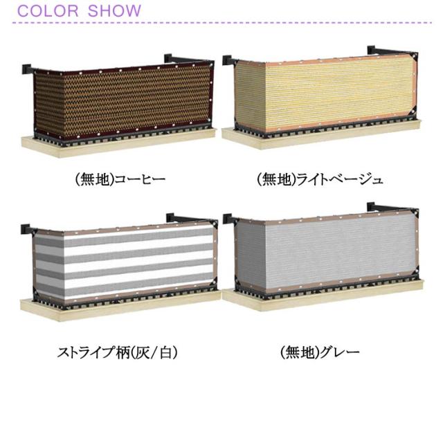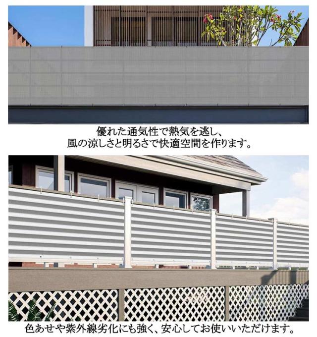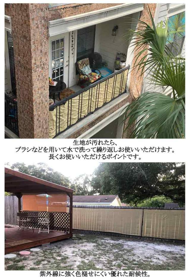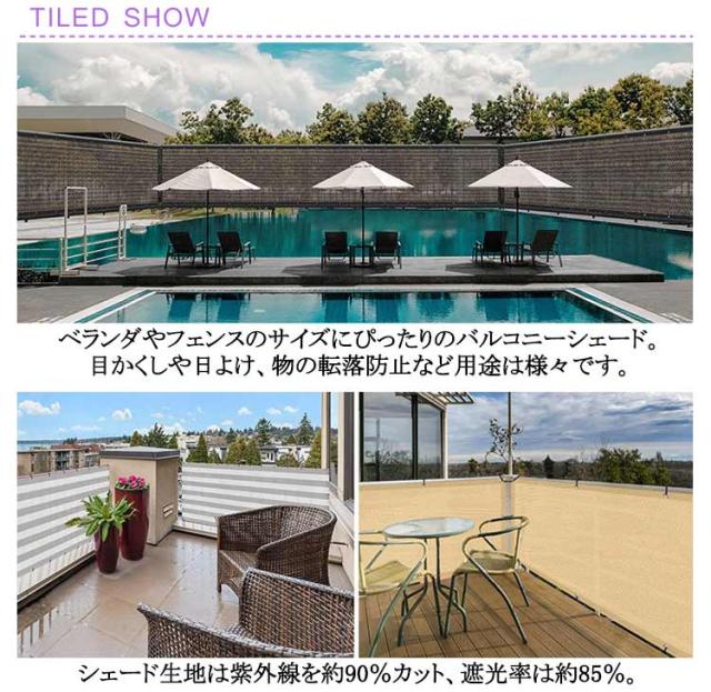 | 【長さ600cm、高さ90/100cm】 日よけや目隠しに便利な通気性が高いバルコニーシェードです。 ベランダやフェンスのサイズにぴったりのバルコニーシェード。 目かくしや日よけ、物の転落防止など用途は様々です。 シェード生地は紫外線を約90%カット、遮光率は約85%。 優れた通気性で熱気を逃し、風の涼しさと明るさで快適空間を作ります。 色あせや紫外線劣化にも強く、安心してお使いいただけます。 生地が汚れたら、ブラシなどを用いて水で洗って繰り返しお使いいただけます。 長くお使いいただけるポイントです。 紫外線に強く色褪せにくい優れた耐候性。 折り畳みによるシワも自然にとれる形状記憶加工。 シーズンオフには折り畳んでコンパクトに収納できます。 | |