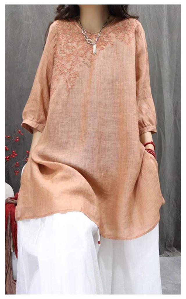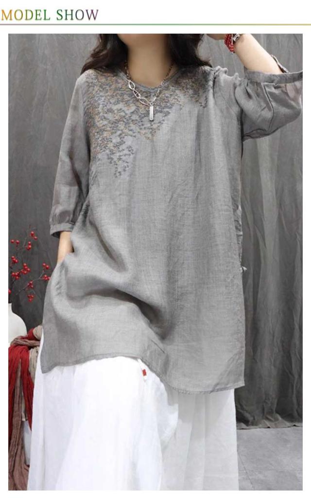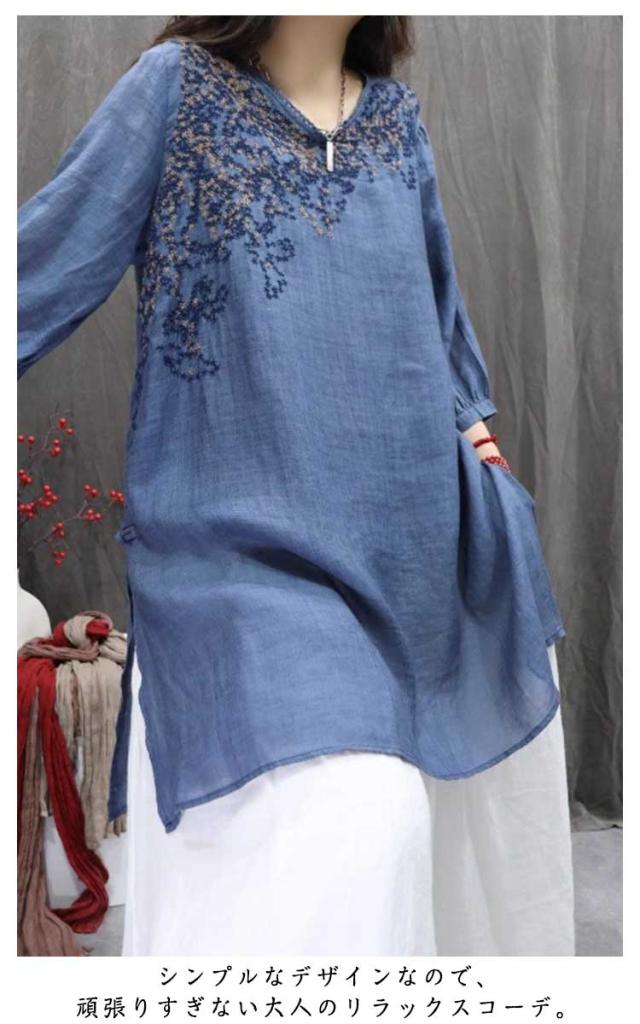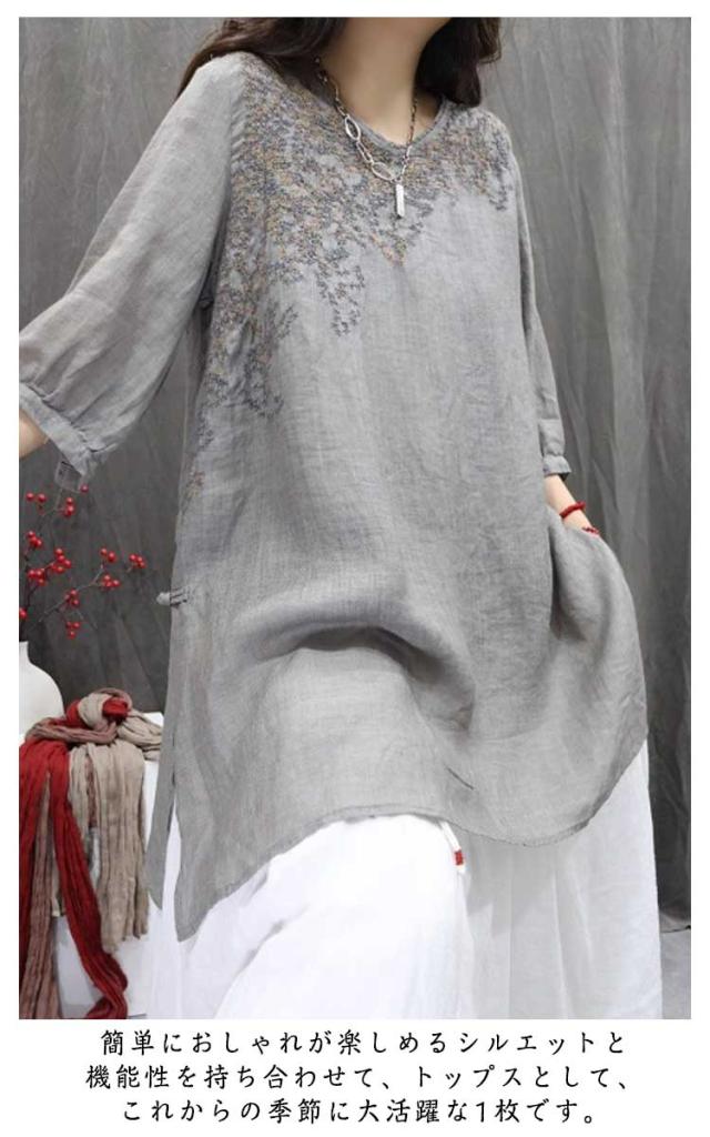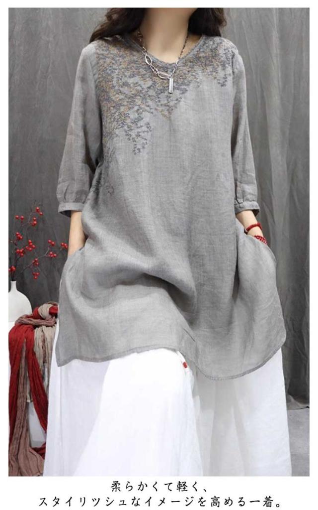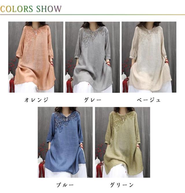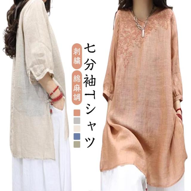 ロング プルオーバー ブラウス レディース 綿麻調 チュニック きれいめ トップス 刺繍 ゆったり カジュアル エレガント 七分袖Tシャツ 大人 七分袖Tシャツ 体型カバー 可愛い 通勤 OL