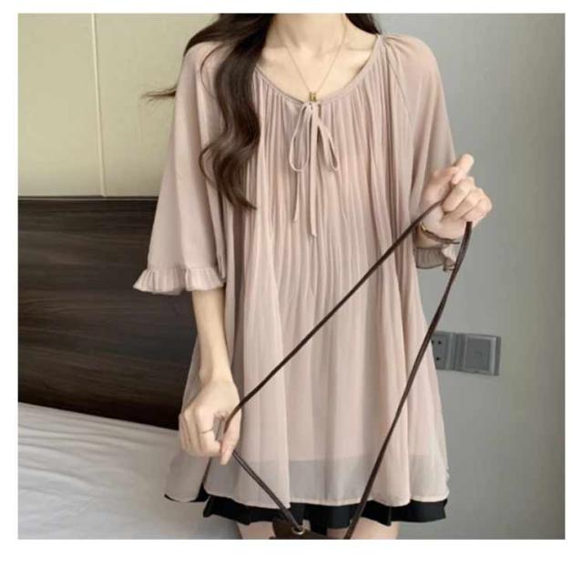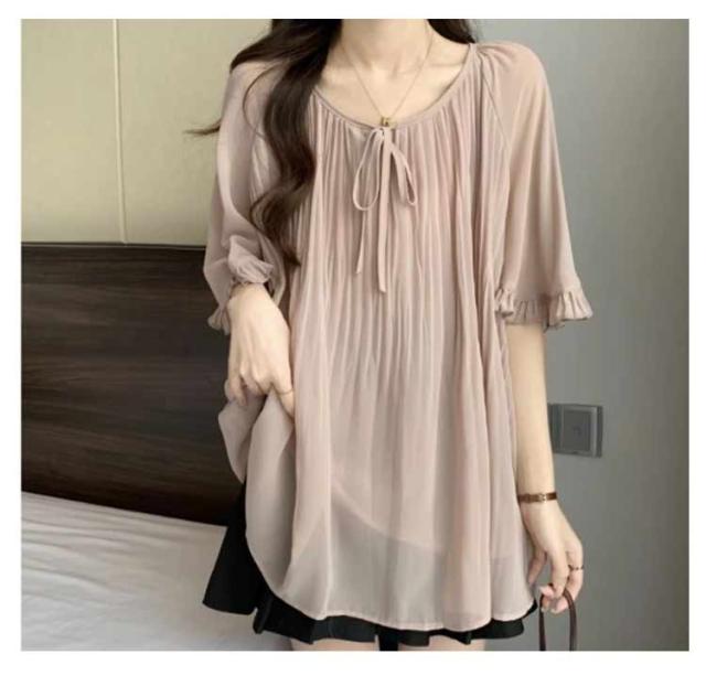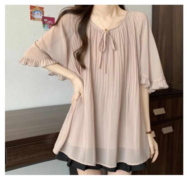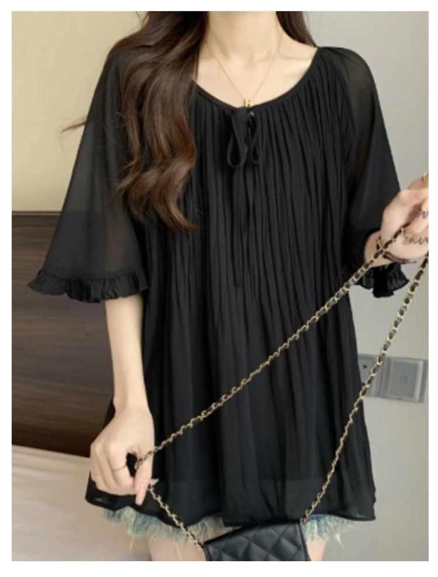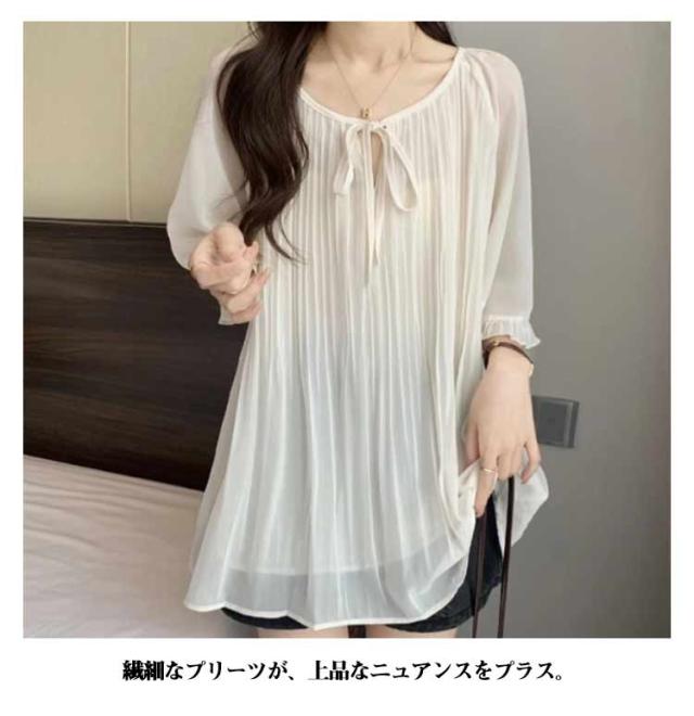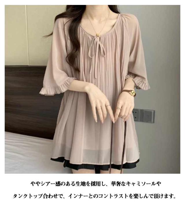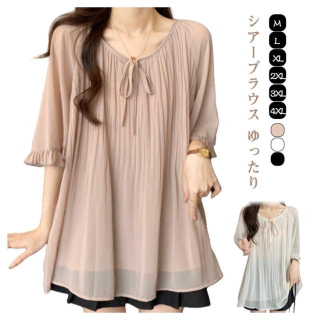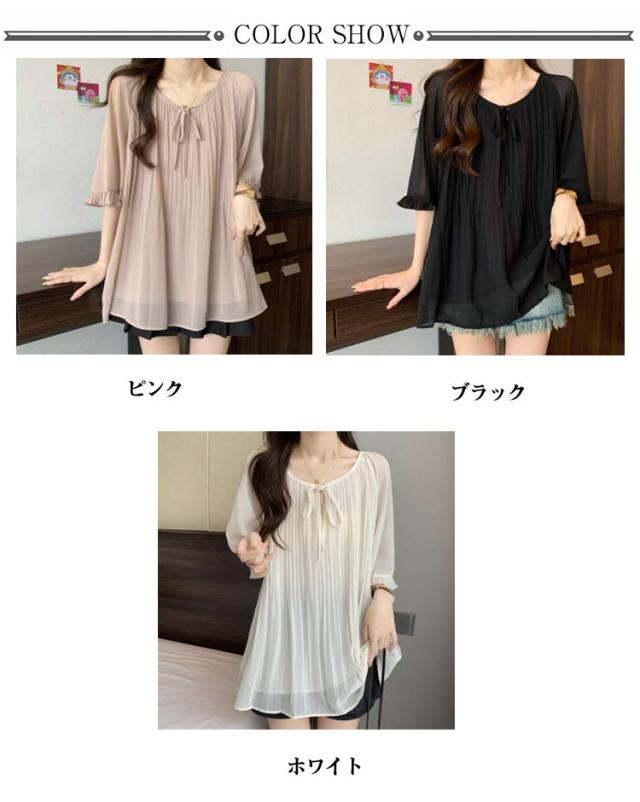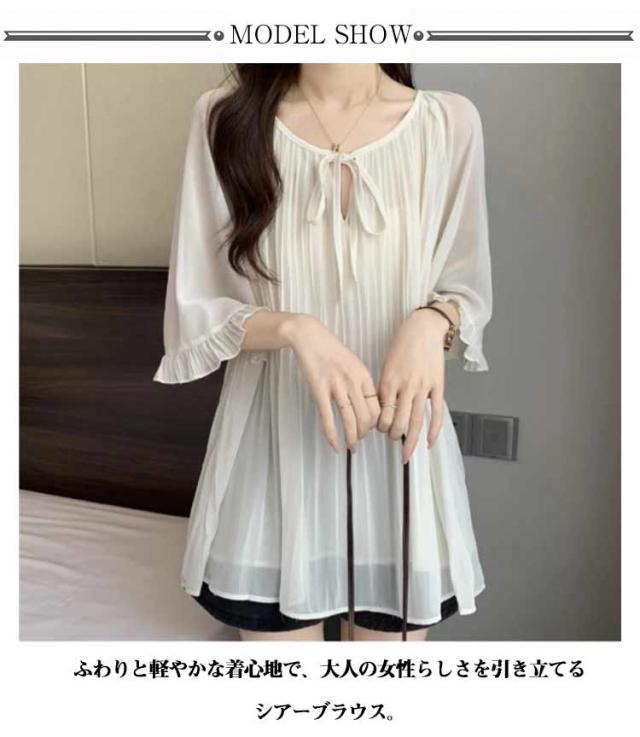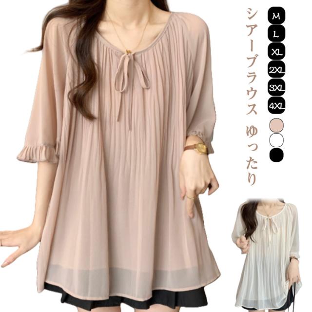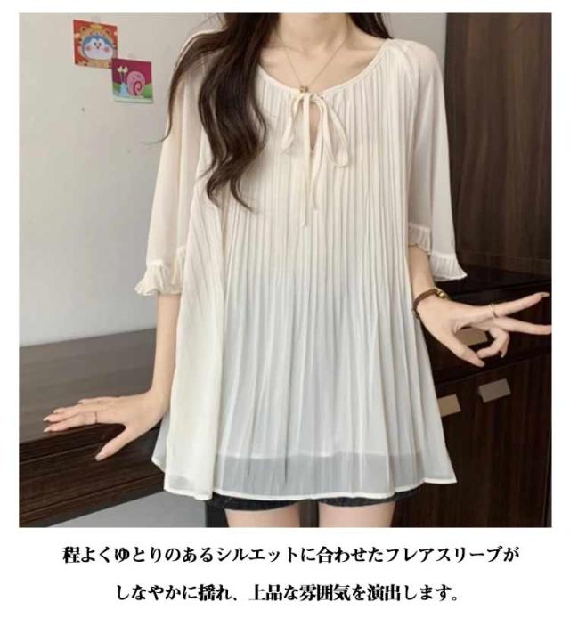プリーツ レディース リボン付き 無地 五分袖 Aライン プリーツ シフォン 薄手 トップス フレアブラウス 夏 シアー シースルー フェミニン シアーブラウス ゆったり 体型カバー 半袖ブラウス 透け感 半袖 きれいめ おしゃれ シンプル エレガント 夏物 白 黒 ピンク