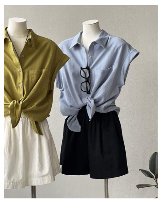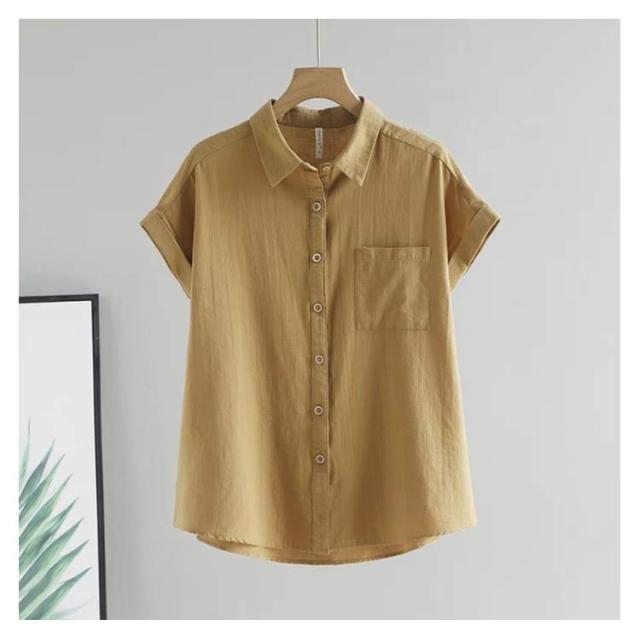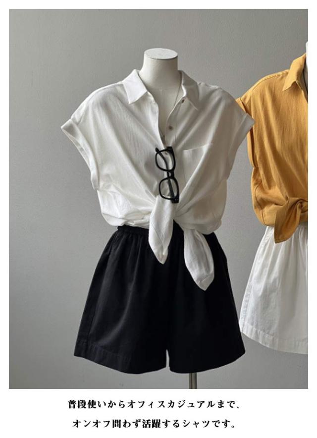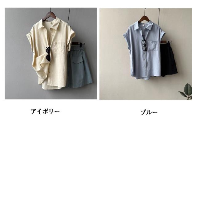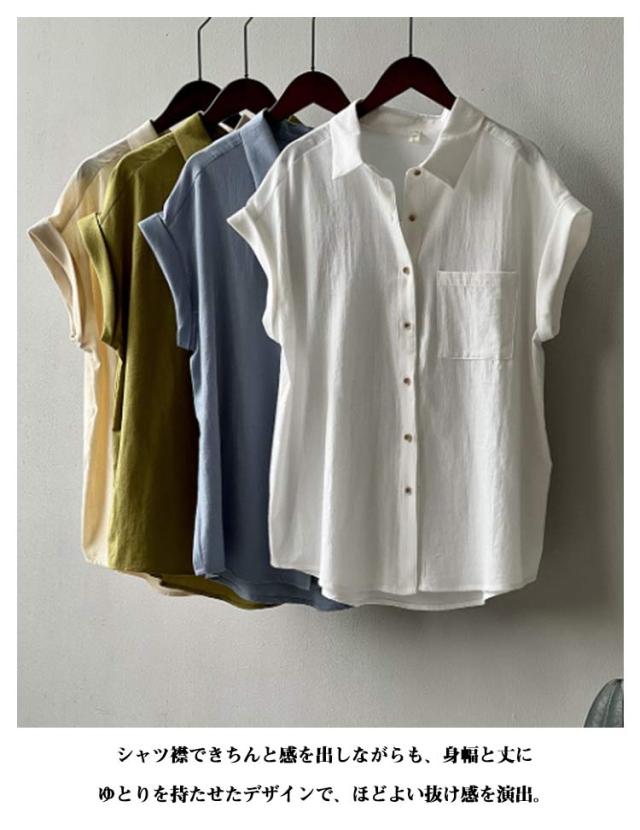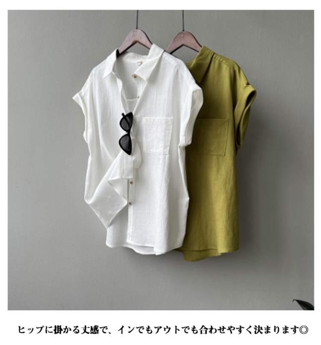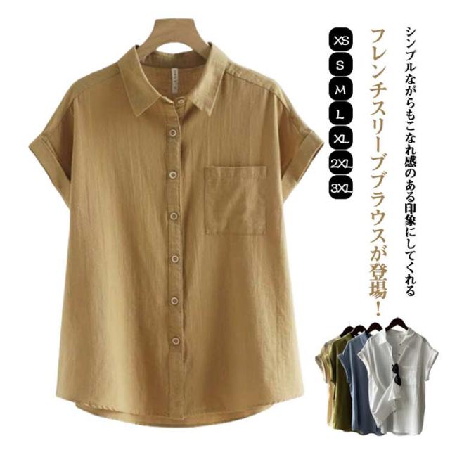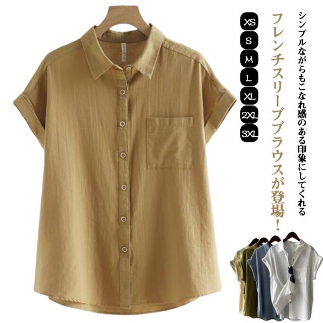 半袖シャツ ブラウス 折り返し袖 薄手 襟付き シャツブラウス 夏 半袖 トップス フレンチスリーブ 無地 レディース 胸ポケット付き 透け感 シフォン ゆったり 体型カバー シャツ シンプル カジュアル おしゃれ 夏物 白 ホワイト ベージュ グリーン 大きいサイズ