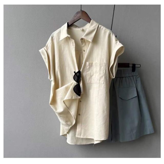 | シンプルながらもこなれ感のある印象にしてくれるフレンチスリーブブラウスが登場! 二の腕がきにならない絶妙な丈で設定したフレンチスリーブは、折り返しディティールが効いたシンプルながらもデザイン性のある一着。 シャツ襟できちんと感を出しながらも、身幅と丈にゆとりを持たせたデザインで、ほどよい抜け感を演出。 ヒップに掛かる丈感で、インでもアウトでも合わせやすく決まります◎ 普段使いからオフィスカジュアルまで、オンオフ問わず活躍するシャツです。 | |