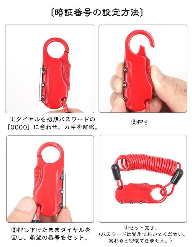 | 超コンパクト!超軽量! 丈夫な亜鉛合金製! 携帯ワイヤーロック 3ダイヤル/100cmコイル ◆丈夫な亜鉛合金製本体と金具、太さ2.5mmのPVCコートコイル式ワイヤーロック。 ・3つの番号ダイヤル式のキーレスで、鍵紛失の心配がありません。 ・長さは約100cm、サイクリング中などで一時的にバイクから離れる、スキーやスノーボードの休憩時などの場面に重宝。 ・表面のPVCコートは柔軟性があり、対象物を傷つけない点も安心。 ・わずか47g(誤差5%)でコンパクト、ポケットに入るサイズで携帯性に優れています。 〔暗証番号の設定方法〕 1.ダイヤルを初期パスワードの「0000」に合わせ、カギを解除。 2.押す 3.押し下げたままダイヤルを回し、希望の番号をセット。 4.セット完了。(パスワードは覚えておいてください。忘れると回復できません。) | |