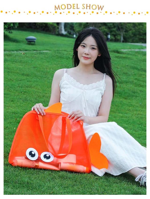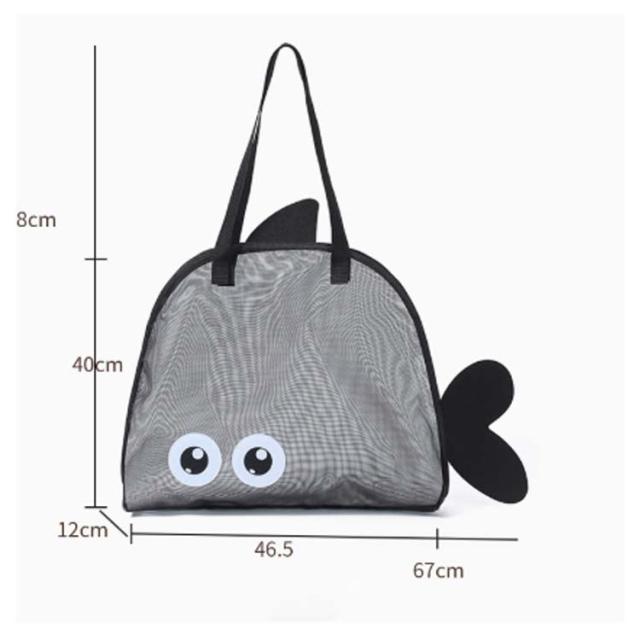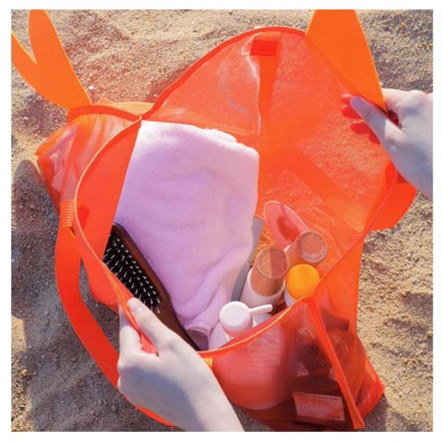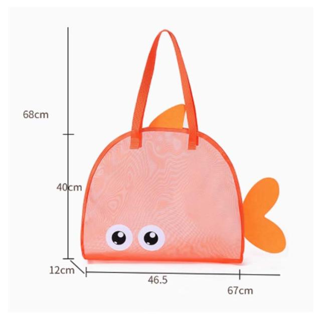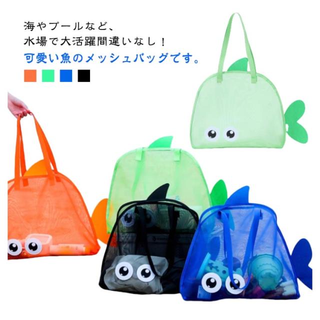 | 海やプールなど、水場で大活躍間違いなし!可愛い魚のメッシュバッグです。 メッシュ生地になっているので砂やドロがバッグ溜まりにくく、また道具を入れたまま水をかけて洗うこともできます。 通気性もあるので、タオルや水着、水鉄砲などの濡れたおもちゃを入れてもOKです。 その他、おもちゃや小さいブロックなどの収納にもオススメです。 お子さんのお出かけや、海や砂遊びにぴったりなアイテムです! | |