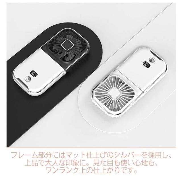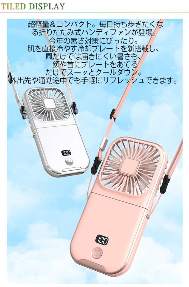 | 超軽量&コンパクト。毎日持ち歩きたくなる折りたたみ式ハンディファンが登場。 今年の暑さ対策にぴったり。肌を直接冷やす冷却プレートを新搭載し、風だけでは届きにくい暑さも、顔や首にプレートをあてるだけでスーッとクールダウン。外出先や通勤途中でも手軽にリフレッシュできます。 バッテリー容量もアップして、より長く、よりパワフルに使えるように。さらに、充電・給電用ケーブルが本体に内蔵されているので、荷物もスッキリ。 フレーム部分にはマット仕上げのシルバーを採用し、上品で大人な印象に。見た目も使い心地も、ワンランク上の仕上がりです。 手持ち・首掛け・卓上の3WAYに、スマホスタンド&機能をプラスした5WAY仕様。動画を見ながら涼めるのもうれしいポイント。 デジタルディスプレイ付きで、バッテリー残量がひと目で確認できるのも便利。Type-C対応で、やPCからの充電も手軽です。 | |
