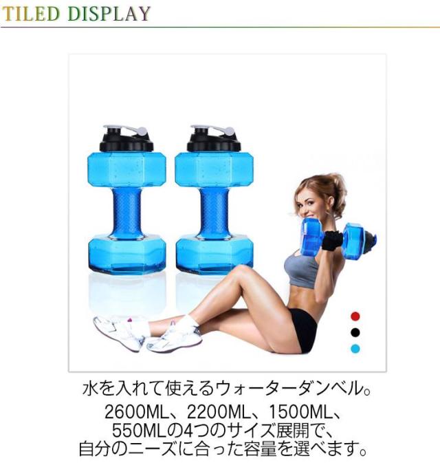 | 水を入れて使えるウォーターダンベル。 2600ml、2200ml、1500ml、550mlの4つのサイズ展開で、自分のニーズに合った容量を選べます。 長時間のトレーニングや外出時にも、十分な水分補給ができます。 軽量で持ち運びやすく、ジムやアウトドア、旅行に便利です。 耐久性に優れたプラスチック素材を使用しており、長期間使用しても丈夫です。 水漏れ防止設計で、安心して持ち運べます。 | |