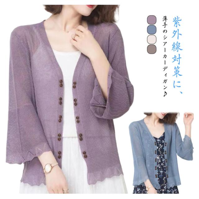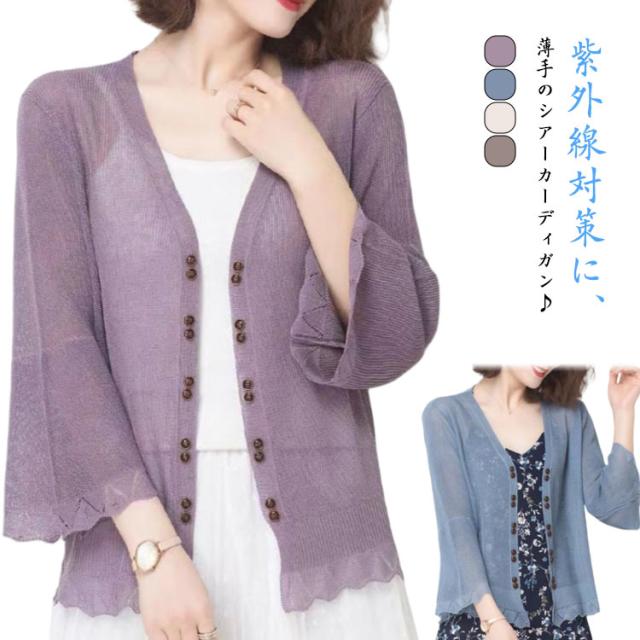 シアーカーディガン ショート Vネック レディース サマーニット サマーカーディガン 軽い フリルカーディガン カーディガン ゆったり UVケア 長袖 紫外線対策 UVカット 冷房対策 シアーカーディガン 薄手 羽織り かわいい