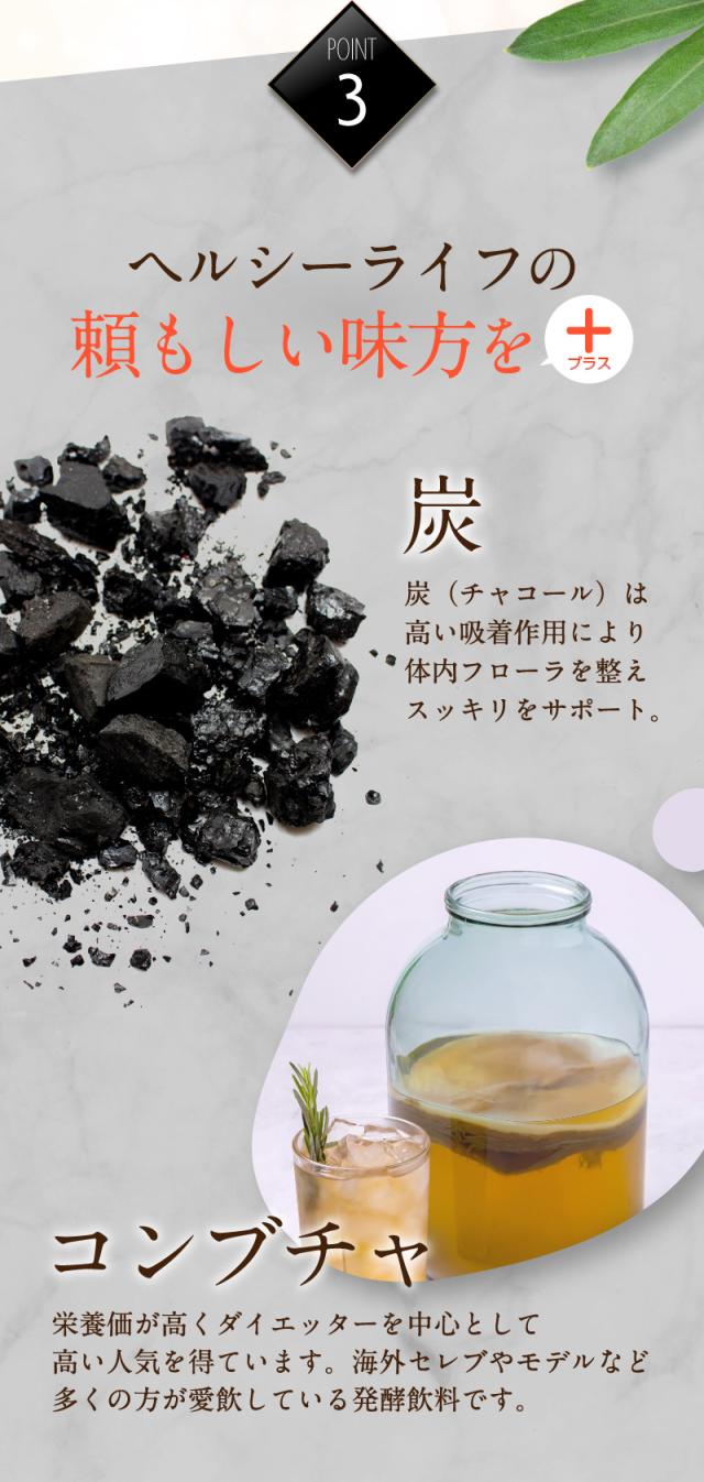 人気の成分、炭(チャコール)とコンブチャも配合しております。