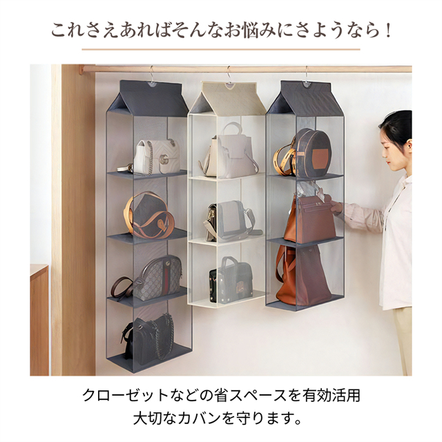 ・クローゼット等に吊るして、バッグをすっきり収納できます。