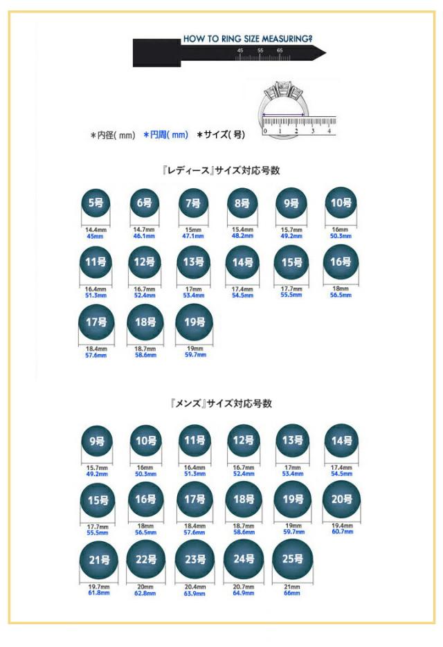 | 石のサイズ | ■レディース ・天然ダイヤモンド1mm(0.005ct) ・スワロフスキージルコニア2石(0.8mm)、8石(0.9mm) ・天然石 約1mm ■メンズ ・天然ダイヤモンド1mm(0.005ct) ・天然石 約1mm |