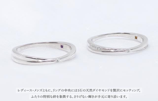 レディース・メンズともに、リングの中央には1石の天然ダイヤモンドを贅沢にセッティング。