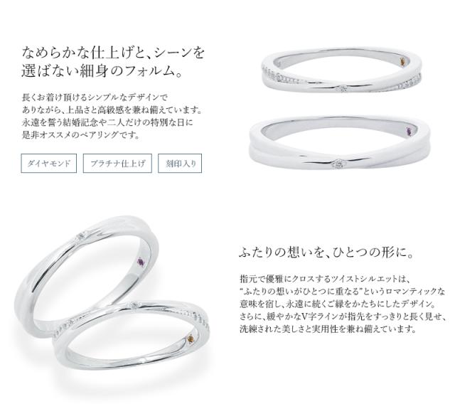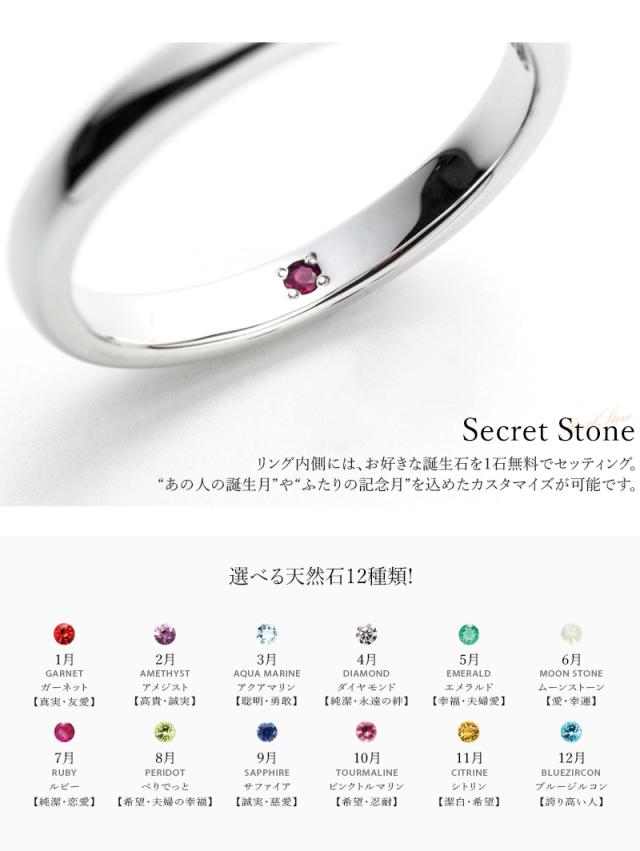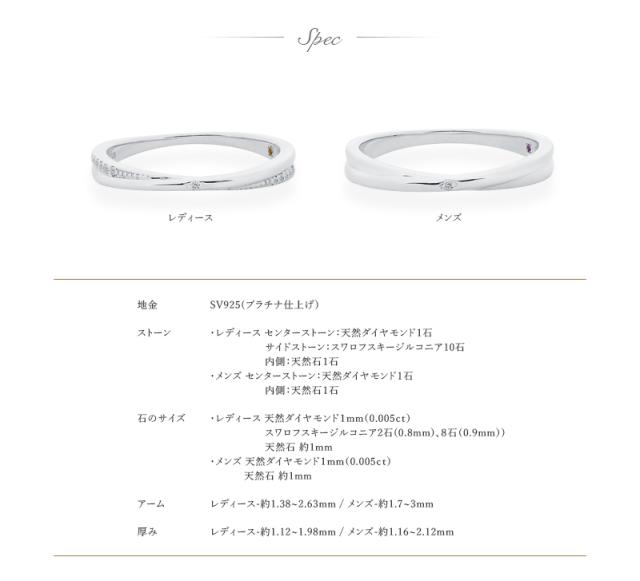 | ストーン | ■レディース ・センターストーン:天然ダイヤモンド1石 ・サイドストーン:スワロフスキージルコニア10石 ・内側:天然石1石 ■メンズ ・センターストーン:天然ダイヤモンド1石 ・内側:天然石1石 |