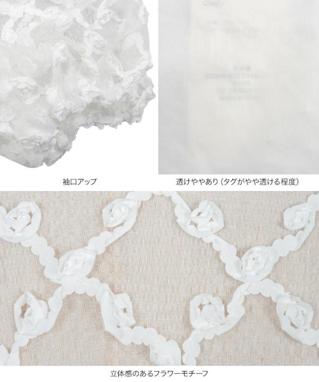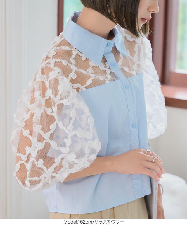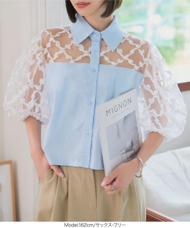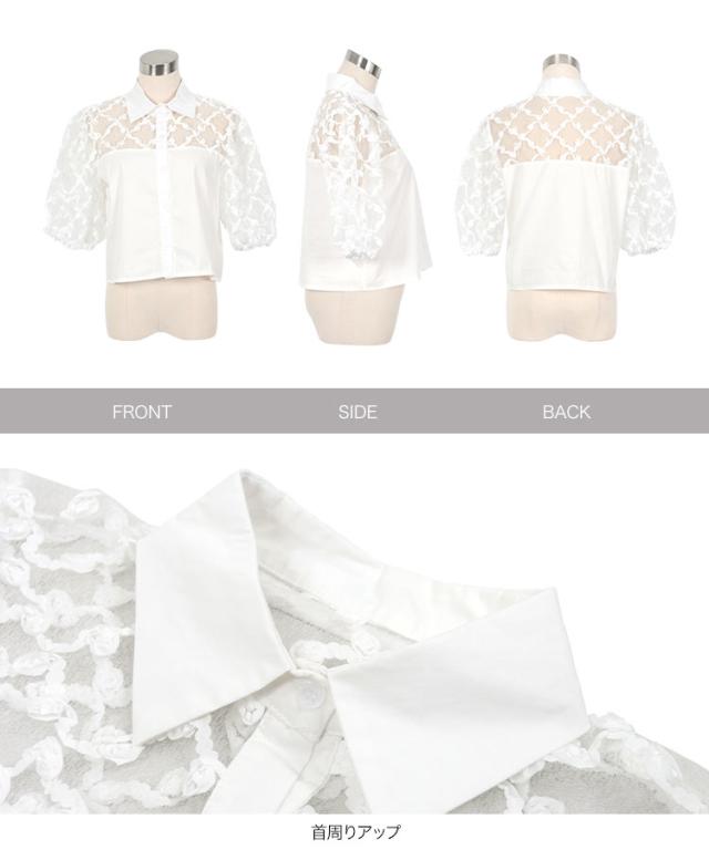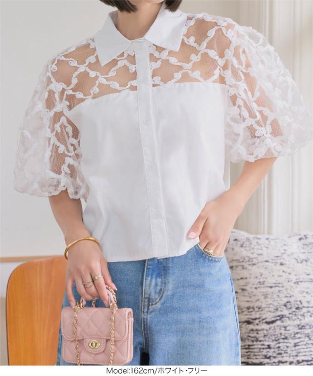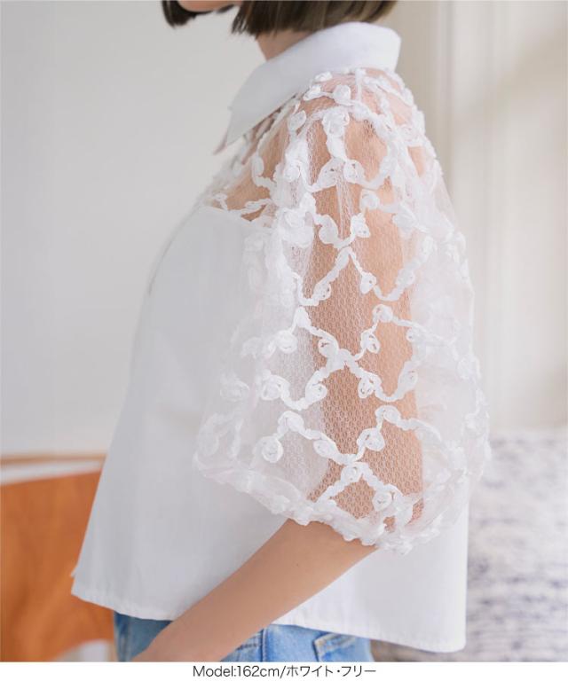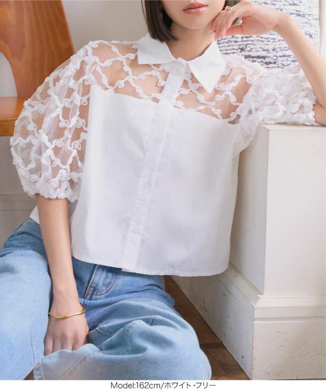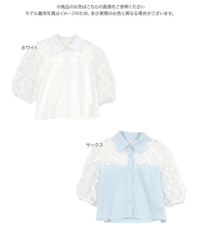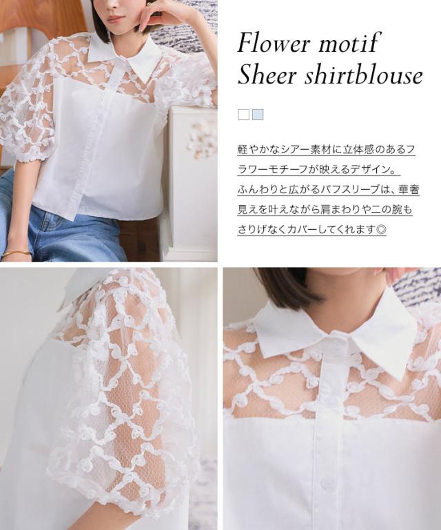 フラワーモチーフシアーシャツブラウス C7615 入荷済 レディース 20代 30代 40代 シアーブラウス フラワーモチーフ 立体フラワー 透け感 抜け感 パフスリーブ 華奢見え 体型カバー シャツ襟 フロントボタン きれいめ 大人可愛い リラックス