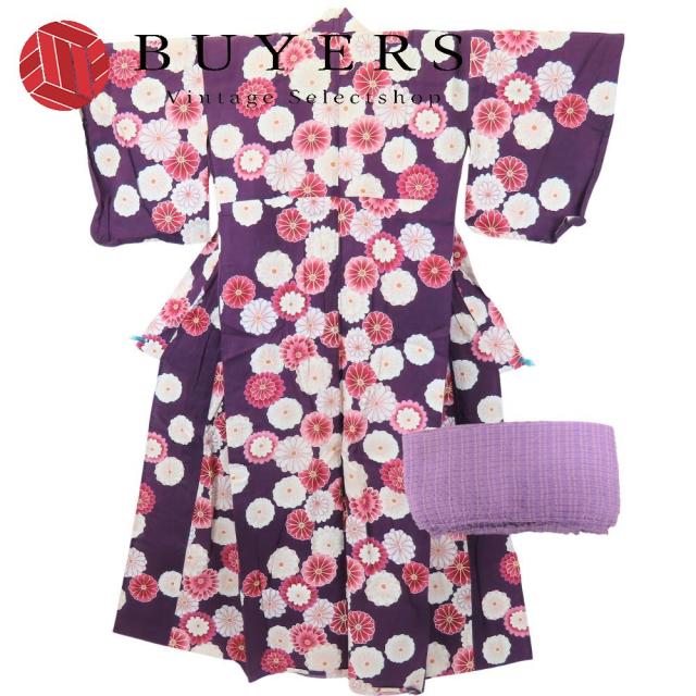 中古 浴衣 2点セット 兵児帯 綿 ポリエステル 紫 マルチカラー 花 ふわふわ 可愛い 和装 呉服 和服 きもの レディース 女性