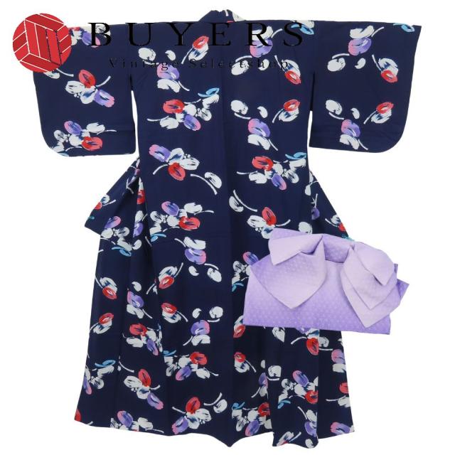 中古 浴衣 セット 作り帯 綿 ポリエステル ネイビー パープル 注染ゆかた かわいい 和装 呉服 和服 きもの レディース 女性