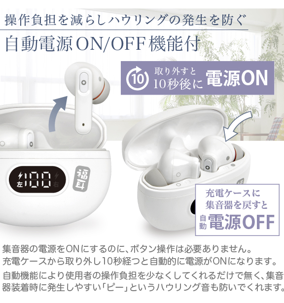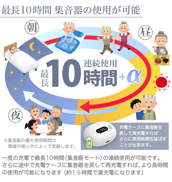 | 集音器:最大約1.5時間、充電ケース:最大約2時間(ともにバッテリーが0%の状態から) |