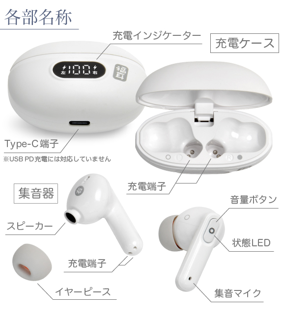 | 集音器:約4.5g(片側)、充電ケース:約33g |