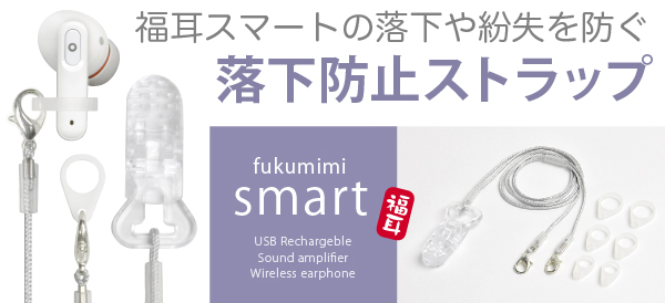 | 福耳スマートに取り付けることで、思わぬ落下による破損や紛失を防ぐ事ができる、落下防止ストラップです。 ※ストラップを取り付けた状態では、集音器を充電ケースに入れることが出来ず、充電を行えません。 充電する時はストラップを集音器から取り外して下さい。 |