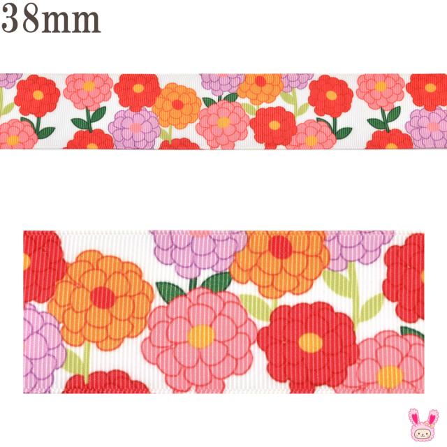 プリントリボン カラフルボリュームフラワーリボン 幅38mm 1m単位 切り売り (3m以上)