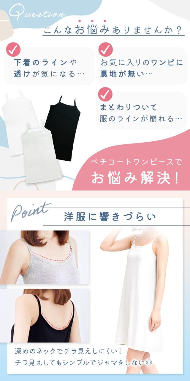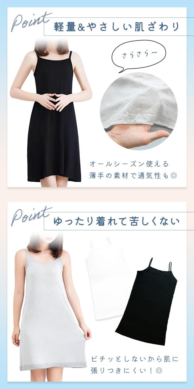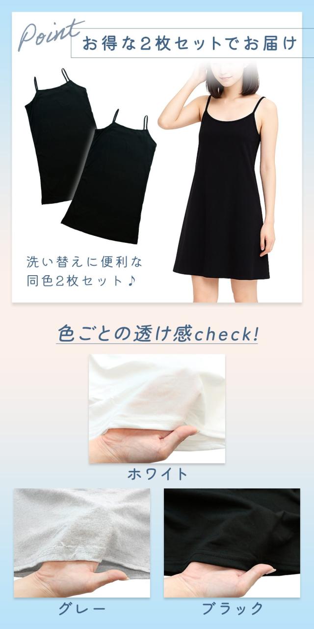 ペチコート/ワンピース/同色2枚/セット/インナーキャミソール/透け防止/インナー/ロング/キャミ/キャミワンピ/キャミワンピース/スリップ/ショート/ミディアム/丈/レディース/下着/ライン/響かない/薄手/下着/オールシーズン/ロングスリップ/ネック/首元/広め/白/灰色/黒/ホワイト/グレー/ブラック