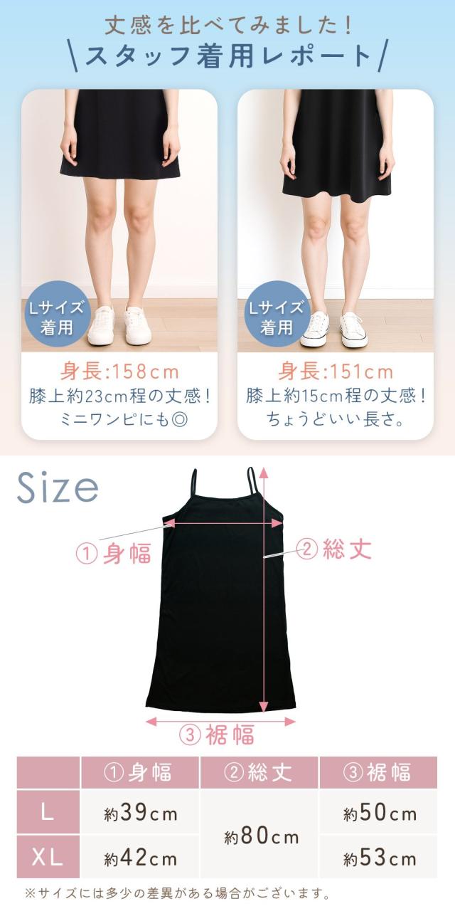インナーキャミソールとしてはもちろん、ロングスリップやキャミワンピースとしても使えるデザイン。