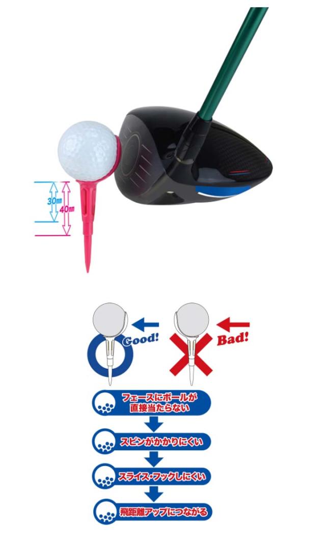 ノンスライスティーMAXは、ゴルフボールが当たる部分まで覆った大きなカップが特徴的で、クラブフェースにゴルフボールが直接当たらないためスピンがかかりにくく、スライスやフックがしにくくなり曲がりが減るためスライスやフックで飛距離をロスしているゴルファーにとても効果があり、フェアウェイキープ率がアップしてゴルフが変わります。 ●軽量設計:3.7gの軽量 ●カップ部:強度と柔軟性に優れた素材で、反発力と柔軟な打球感をともに感じることができ、ティーに当たった感触がほぼないソフトフィーリングを実現 ●スリット部:ヘッドによる風圧を逃し、クラブスピードを落とさないスリット構造 ●2段構造:2段構造により30と40のティーアップが可能です ●軸部:クラブスピードが落ちずにインパクトできるよう極限まで細くし、柔軟性に優れた素材を使用 ●ノンスライスティーMAXはゴルフ規則(R&Aルール)に適合していません。 |