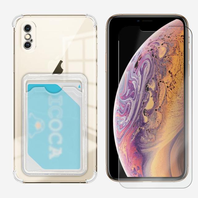 【四隅TPU ソフト背面カード収納ケース 1個+ガラスフィルムセット 1枚】iPhone Xs 四隅がエアクッション構造 衝撃吸収 落下・すり傷防止/ワイヤレス充電対応/滑り止め 薄型 カバー アイフォンXs ケース iPhoneXsカバー アイフォン シリコン TPU素材 ソフトケース