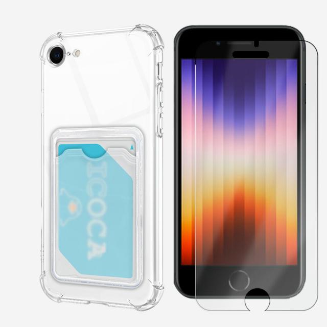 【四隅TPU ソフト背面カード収納ケース 1個+ブルーライトカットガラスフィルムセット 1枚】 iPhone SE 第2世代 2020年 四隅がエアクッション構造 衝撃吸収 落下・すり傷防止/滑り止め 薄型 カバー iPhone SE2 カバー アイフォンse2 カバー シリコン ソフトケース