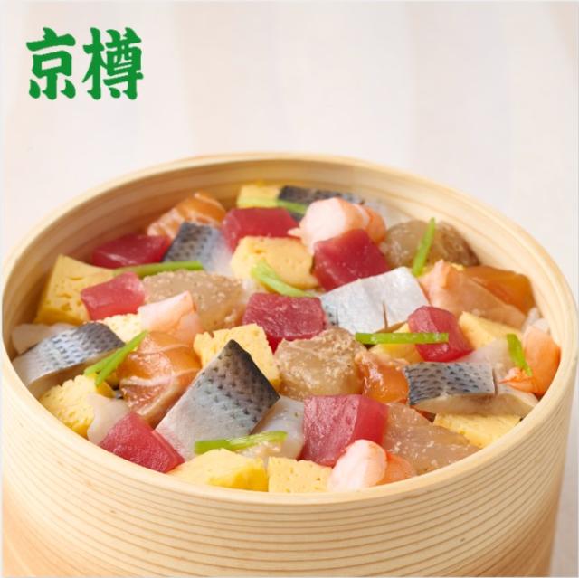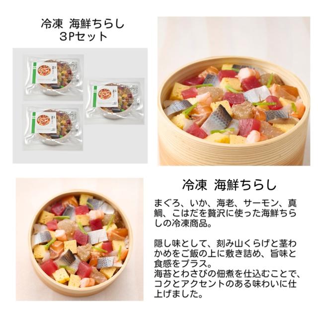 まぐろ、いか、海老、サーモン、真鯛、こはだを贅沢に使った海鮮ちらしの冷凍商品。