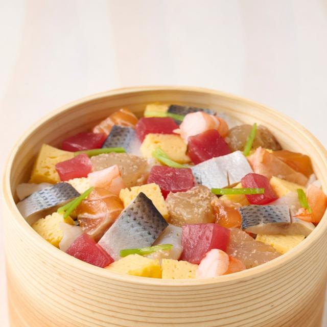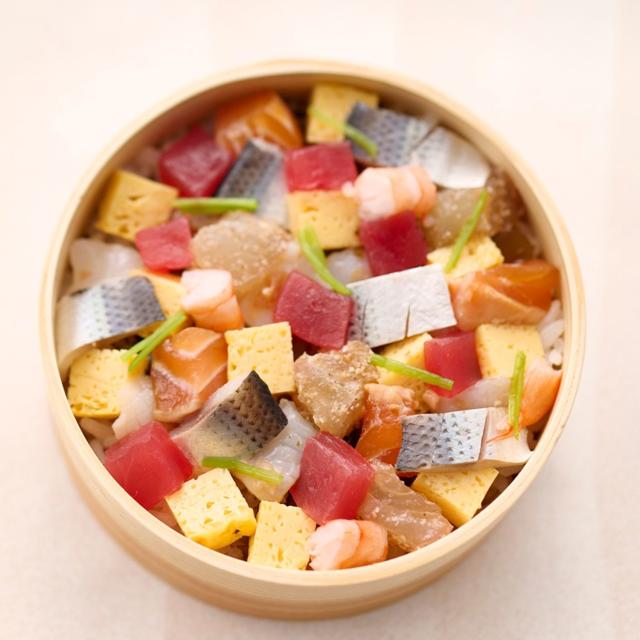 まぐろ、いか、海老、サーモン、真鯛、こはだを贅沢に使った海鮮ちらし
