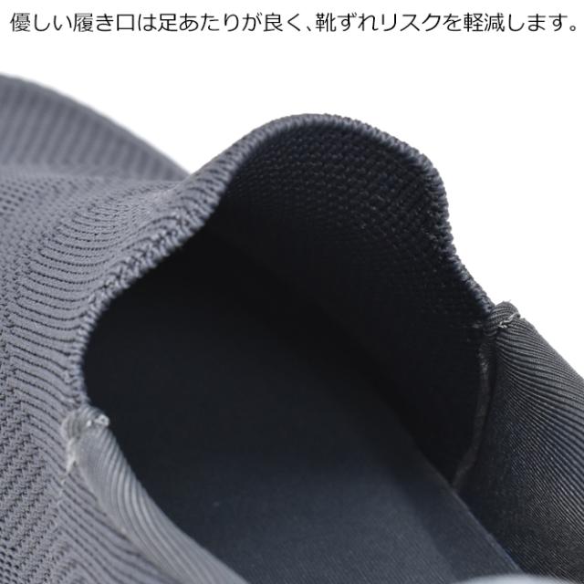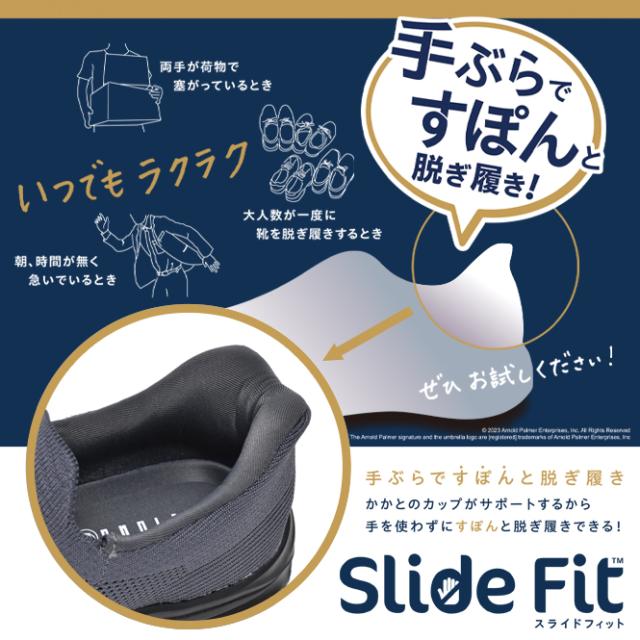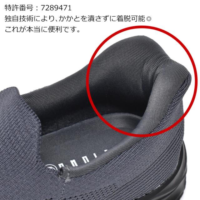 特許取得の「月型芯構造」(特許第7289471号)を採用し、かかとに体重をかけるだけでサッと履けるスライドフィットのスリッポン。