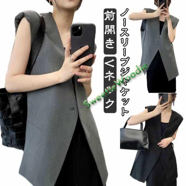 前開き ロングベスト ジレ ノースリーブ ノーカラーベスト ロングジレ ベスト 春夏 カジュアル ジレジャケット ノースリーブジャケット ジレ チュニック丈 おしゃれ エレガント フォーマル Vネック 通勤 ブラック